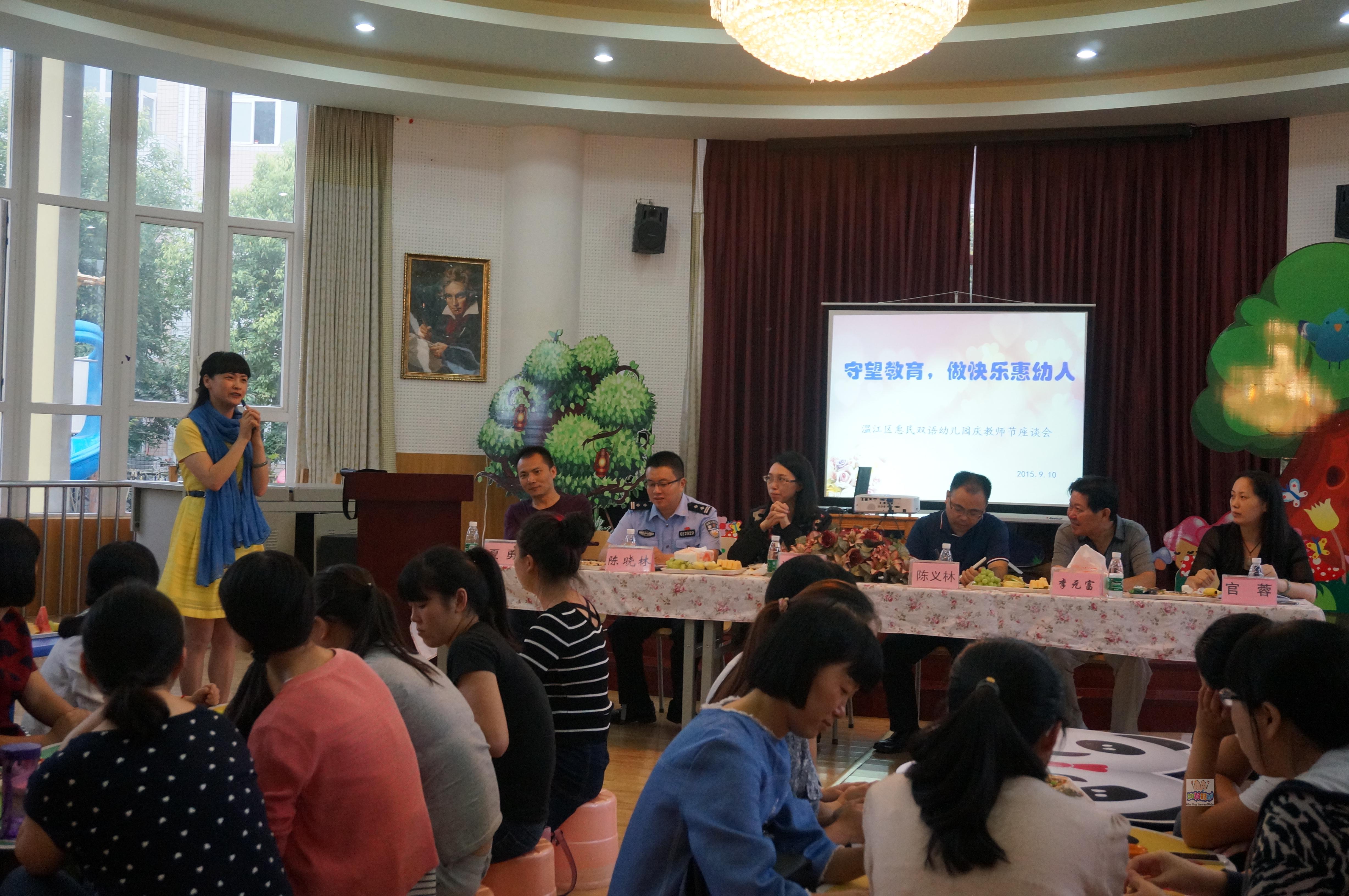 9月10日下午,公平街办党工委书记、人大主任陈义林,公平街办党工委委员、街道办事处副主任郑雪梅,公平街办党工委委员,公平派出所所长陈晓林,公平街办关工委常务副主任李元富,公平街办惠民社区党组书记官蓉,社区教育学院公平分校校长夏勇及惠幼全体教职员工在多功能厅开展了主题为“守望教育,做幸福的惠幼人”教师节座谈会。