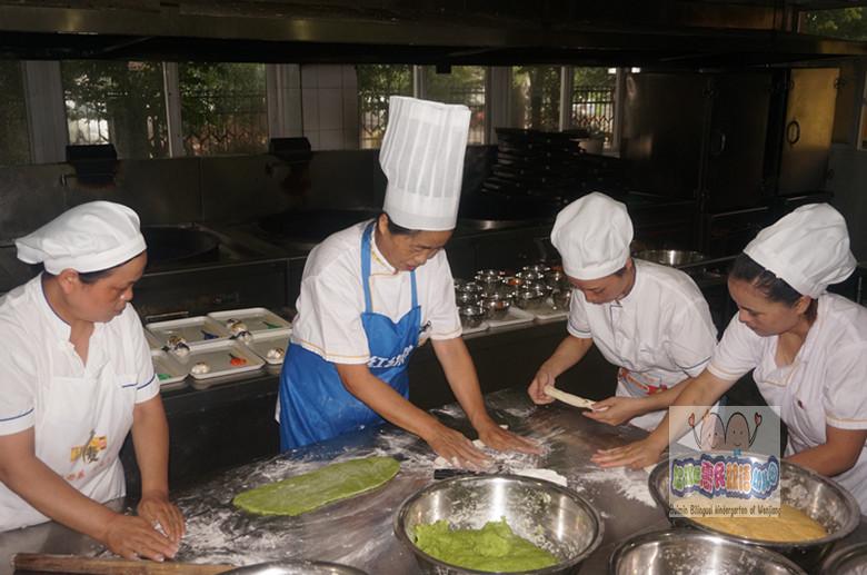 接下来,培训进入了实操环节。为了让实操顺利进行,温江区惠民双语幼儿园提前准备好了操作所需的各种新鲜丰富的食材以及各类操作工具。实战演练开始了,在主训刘老师的语言指导下,厨师达人冉老师向大家一一呈现了肉松水果糯米团、花样百出的肉菜包子,造型丰富的彩色花卷的不同做法,面点的各种创新给大家带来视觉与思想的冲击。惊叹之余,全体厨师学员们迫不及待地开始实践尝试:只见各色漂亮的面团在学员的手中飞舞、翻滚、整形、剪切……不一会,如变魔术般一个个外形独特的漂亮面点摆满了各组的托盘。看到这一切,不禁感叹,原来创新无处不有,只需点拨,厨师们的想象力便被激发了,孩子们享受这么多好看美味又营养的面点,该是多么的开心幸福啊。