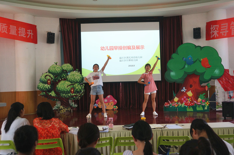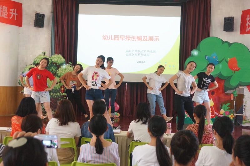 早操是幼儿园一日活动的重要环节,是幼儿园教师必须掌握的专业技能之一。为更好规范教师早操动作,让孩子们爱上锻炼, 8月29日上午,一场音乐飞扬,动感舞步的教师早操展示活动在多功能厅展开,惠民双语幼儿园、红桥幼儿园全体保教人员参加。